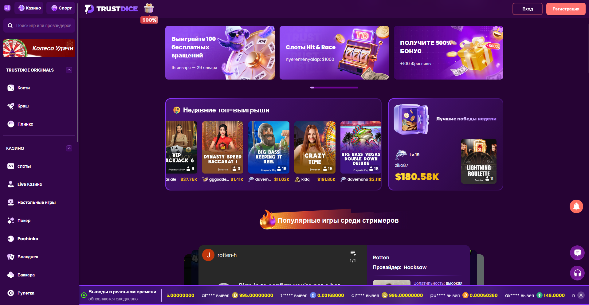 - Originals - власні розробки TrustDice з механізмом Provably Fair (Dice, Crash, Plinko)